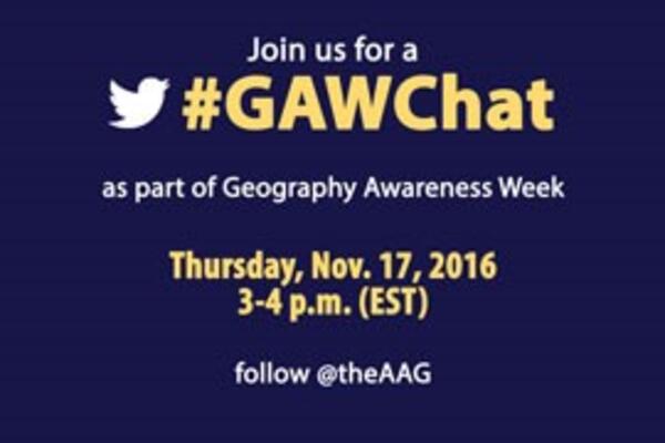 Geography Awareness Week is an annual celebration of geography and the important role it plays in our lives. Founded by presidential proclamation in 1987, Geography Awareness Week is observed during the third week of November each year. Join the AAG #GAWChat on Nov. 17 Don't miss learning more about