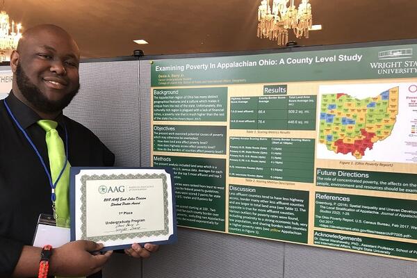 Denis Barry, a senior Geography major, won first prize for his poster at the 2018 East Lakes Division of the American Association of Geographers (AAG) Annual Meeting held at Ohio Northern University this past weekend. The honor came with a $100 cash prize. In addition, faculty from Ohio State