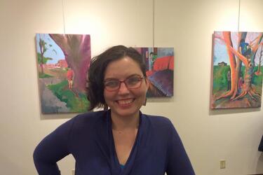 Heather Lea Reid, an alumna of the Master of Humanities Program, recently gave a paper at the Southeastern College Art Conference in Columbus. Her talk was based on the capstone project she did for her MHUM degree and was entitled "Know Your Place: Women in Art (Part 2)". Heather is pictured here standing in front of some of her own artwork, which she exhibits regularly throughout Ohio.