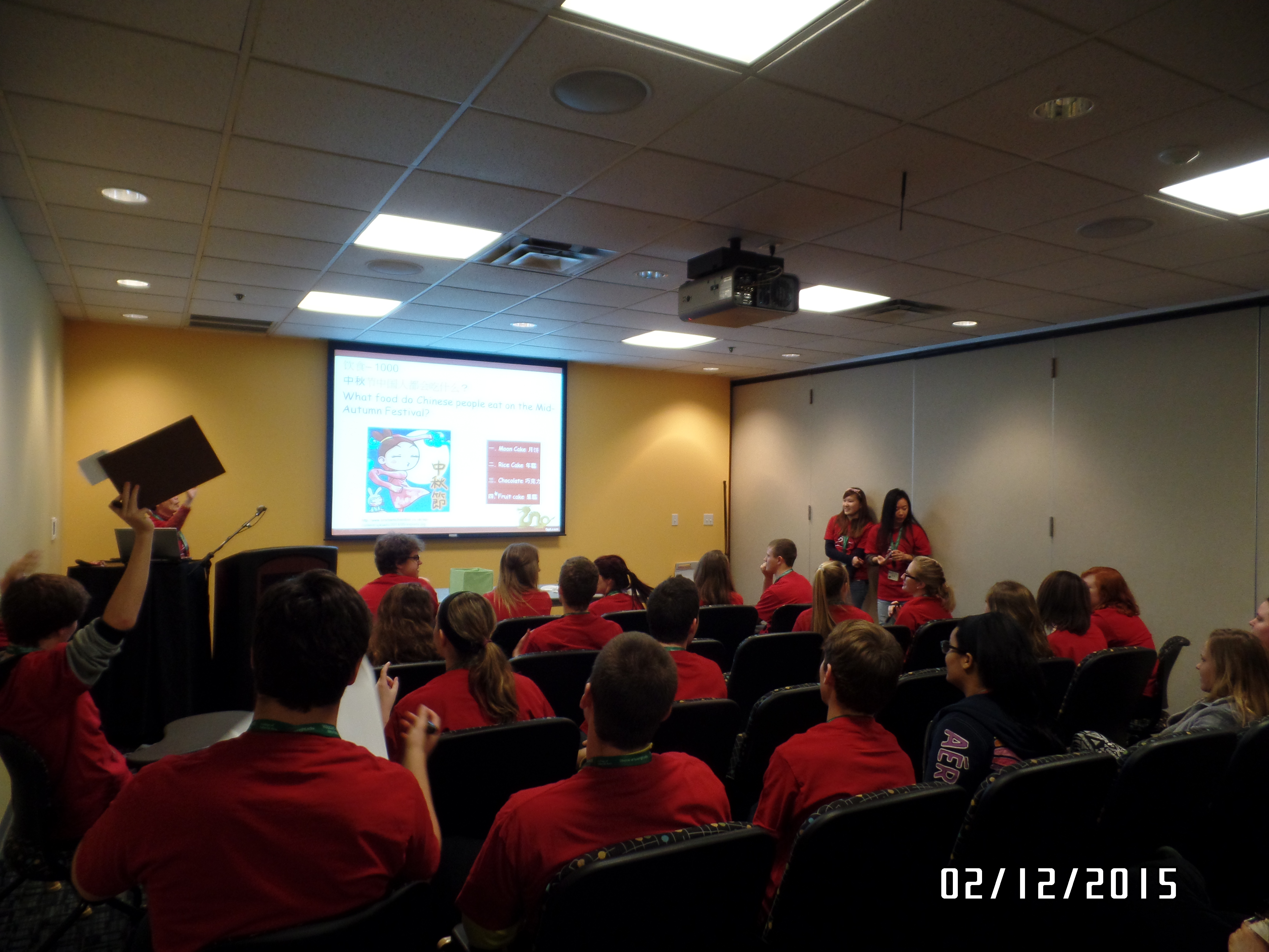 The Department of Modern Languages hosted its second Chinese Immersion Day on February 12, 2015 in the Student Union Apollo Room. Chinese instructors, Haili Du and Maan Broadstock, organized the immersion experience for 117 high school students with one year or more of Chinese language instruction and together, we celebrated the Year of the Goat and helped students to deepen their knowledge of the Chinese language and culture. The students and their teachers represented six schools: Dayton Regional STEM School, Northmont HS, Miami Valley School, Bishop Ready HS, Bellbrook HS and Cincinnati Hills Christian Academy. Dr. Marie Hertzler, Chair of the Department of Modern Languages, welcomed the students, commended them on becoming bilingual citizens of the 21st century and encouraged them to continue language study.