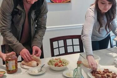 On January 28th, Arabic professor Amira Orr took her Arabic 1020 class to the Rockafield Alumni Center kitchen to teach her students about Middle Eastern food. They made Kofta (Middle Eastern meat balls), Hummus (chick peas dip), Lebna (cheese), salad, Taheena (sesame seed paste), Pita Bread and Green Mint Tea.