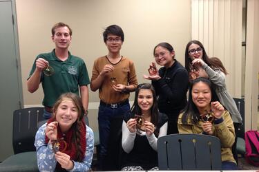On Friday, November 13, the Chinese Club met for a fun craft making event. Dr. Broadstock and the Club officer, Courtney Crawford, taught the students how to make festive Chinese knotting. The students were at varying levels of progression in the Chinese language, so they were able to teach each other new words and phrases.