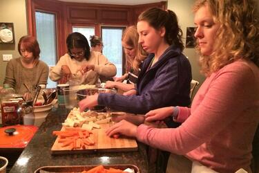 The French Club celebrated the Holiday season on Saturday November 21, 2015 at Professor Daddah's house. Professors Daddah and Abadie cooked a traditional French meal with the students. The feast included some "oeufs mimosa" (hard boiled eggs with homemade mayo), goat cheese and apple salad, French onion soup with homemade cheese croutons, roasted chicken with fresh herbs and grilled root vegetables and the traditional crepes. Miam! It was a great opportunity to speak French and enjoy some delicious French food.
