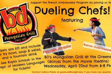 On Wednesday, April 22, 2015 dueling Chefs and French professors Karine Daddah and Pascale Abadie battled it out behind the grill at BD Mongolian Grill to support the students' fundraiser for the French Ambassador Program! It was a fun and entertaining evening!