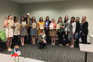 On Friday, March 11, twelve students were nominated for lifetime membership in the Wright State chapter of Sigma Delta Pi, la Sociedad Nacional Honoraria Hispánica. They met the strict scholastic requirements for membership, maintaining a minimum 3.5 GPA in their Spanish courses and a 3.2 overall GPA. The Iota Omega chapter of Sigma Delta Pi upholds the Society’s commitment to recognizing outstanding scholarship in the Spanish language and to promoting continued interest in Hispanic literatures and cultures.