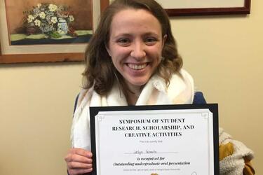 Congratulations to French Major, Jaclyn Schmitz mentored by Kirsten Halling- Experiences of the "Great War" on her Symposium of Student Research, Scholarship and Creative Activities Award!